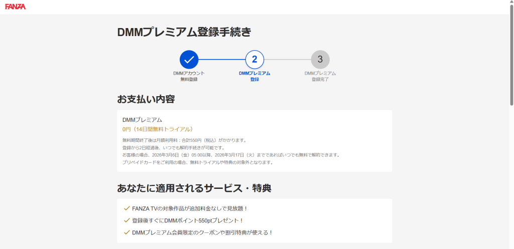 登録の全体的な手順については → FANZAプレミアムの登録方法・料金・解約まで